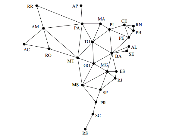 1) O grafo dos estados do Brasil é definido assim: cada vértice é um dos estados da República Federativa do Brasil; dois estados são adjacentes se têm uma fronteira comum. Quantos vértices tem o grafo? Quantas arestas?